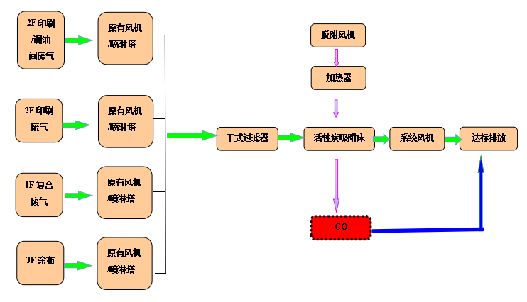 根據(jù)該公司的要求及我司有機廢氣的治理經(jīng)驗,采用干式過濾、活性炭吸附處理有機廢氣,活性炭吸附飽和以后采用CO催化氧化裝置對其進(jìn)行脫附。